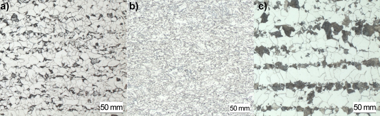 Die Gefüge eines TM-gewalzten DI-MC 355 (a) und eines DI-MC 460 (b) im Vergleich zu einem normalisierten Gefüge (c)