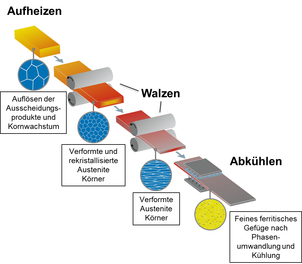 Anschließend erfolgt die thermomechanische (TM) Walzung. Sie wird im Unterschied zu den klassischen Walzverfahren nicht nur als Formgebungsverfahren, sondern auch gezielt zur Einstellung von mechanischen Eigenschaftskombinationen genutzt. Der Prozess erfolgt in drei Schritten: