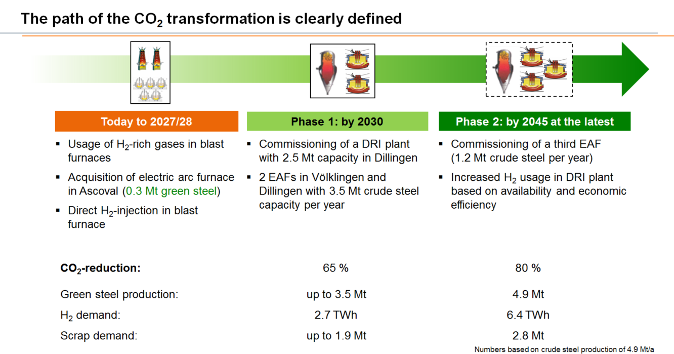 After a detailed review of various location and technology options, the supervisory bodies of Germany’s third-largest steel producer in aggregate decided in favor of comprehensive transformation of steel production at the plants in Dillingen and Völklingen. This demonstrates a clear commitment to the home location of Saarland, which previous analyses have shown to be the most competitive. Preparations and measures to implement the first phase of the project will now be initiated by 2027.